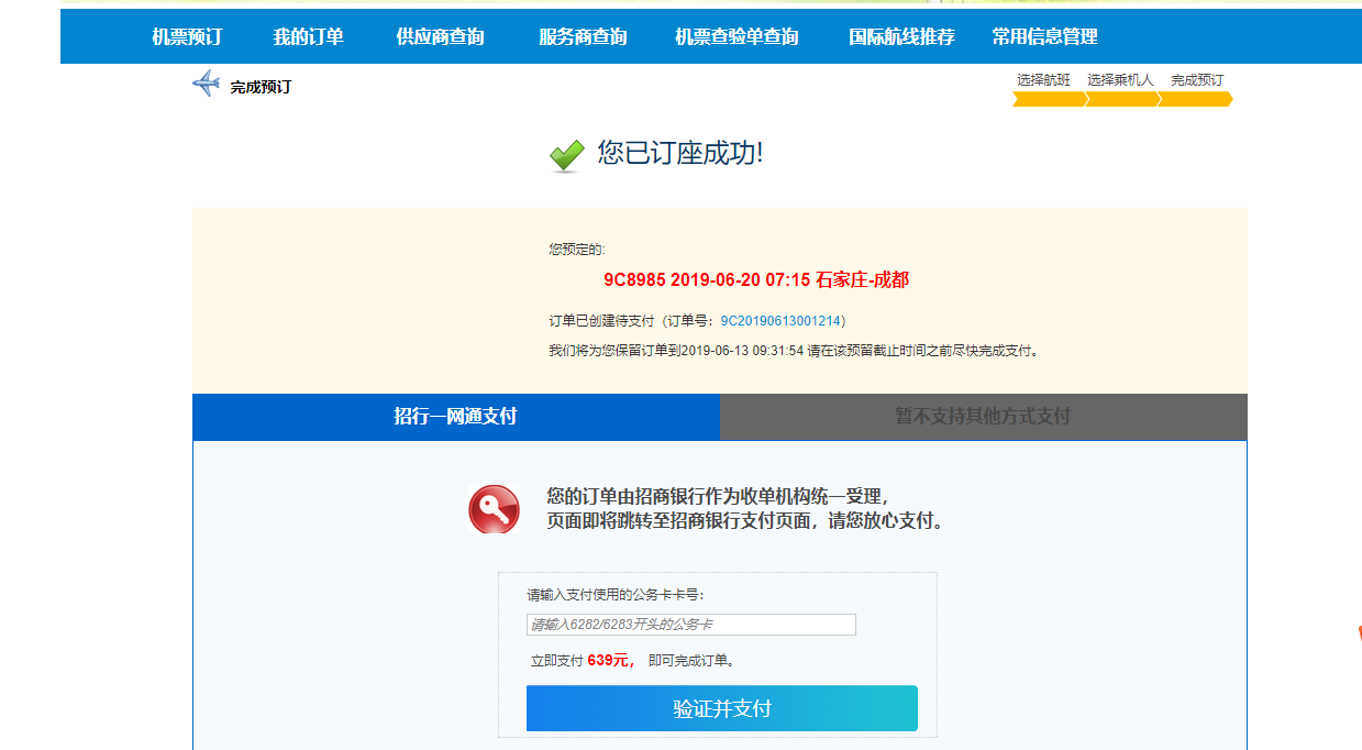 2.选择出行的航班并按提示步骤预定。购票人持公务卡为多名同行公务人员购买公务机票时,在公务人员身份验证全部通过的情况下,可同时为最多9个“同行购票人”购票,并使用本人或他人公务卡支付。购票人应确认公务卡内额度充足,且“同行购票人”必须与购票人选择同一舱位。